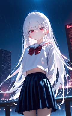 masterpiece,best quality,high quality,loli,1girl,solo,long hair,rain,skirt,white hair,outdoors,sailor collar,shirt,looking at viewer,long sleeves,red eyes,bow,white sailor collar,school uniform,sky,white shirt,red bow,night,blush,tears,closed mouth,bowtie,crying with eyes open,crying,black skirt,cloud,serafuku,red bowtie,building,very long hair,cityscape,city,cloudy sky,standing,blue skirt,skyscraper,
