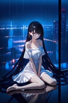 masterpiece,best quality,1girl,long hair,solo,dress,very long hair,black hair,rain,sitting,reflection,white dress,cityscape,off shoulder,skyscraper,window,city,building,indoors,looking at viewer,bare shoulders,city lights,short sleeves,barefoot,reflective floor,off-shoulder dress,wariza,night,hand between legs,