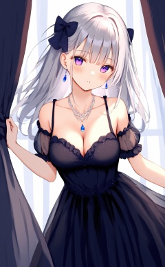 masterpiece,best quality,high quality,(colorful),artist Alens,nai3 Style,Artist:matchanear,Artist:CyanAutumn,Artist wlop,loli,1girl,solo,dress,curtains,long hair,purple eyes,jewelry,grey hair,necklace,short sleeves,black dress,curtain grab,breasts,detached sleeves,collarbone,puffy sleeves,bare shoulders,looking at viewer,puffy short sleeves,hair bow,bow,cleavage,sleeveless,medium breasts,sleeveless dress,see-through,frilled dress,parted lips,earrings,