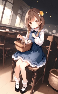 masterpiece,best quality,high quality,(colorful),[artist Alens,Artist ke-ta,artist\:gomzi,artist\:kedama milk,Artist dsmile,artist wlop],loli, 1girl, flower, solo, twin braids, braid, socks, brown hair, hair flower, white socks, hair ornament, yellow flower, shirt, white shirt, dress, sitting, bug, frilled socks, shoes, butterfly, long hair, long sleeves, frills, blue dress, looking at viewer, black footwear, chair, holding, closed mouth, blush, smile, brown eyes, collared shirt, indoors, twintails, mary janes, basket, frilled dress, sleeveless dress, neck ribbon, ribbon, hair over shoulder, on chair, sleeveless, bobby socks, low twintails