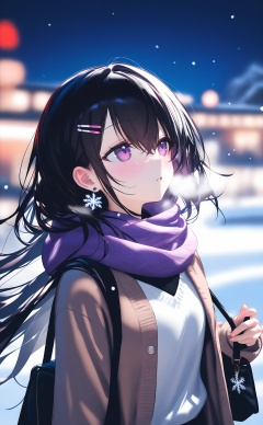 masterpiece,best quality,high quality,loli,1girl,scarf,solo,black hair,long hair,bag,looking up,hair ornament,snowflakes,long sleeves,snowing,hairclip,purple scarf,open clothes,parted lips,skirt,cardigan,outdoors,blurry,night,blush,upper body,sweater,purple eyes,breath,shoulder bag,pink eyes,shirt,earrings,blurry background,white shirt,hair between eyes,