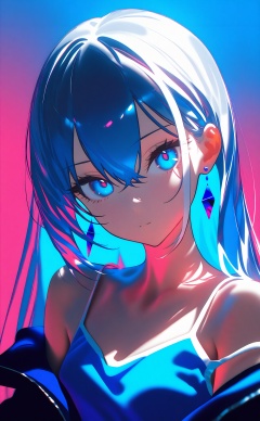 masterpiece,best quality,high quality,1girl,solo,long hair,looking at viewer,blue eyes,upper body,head tilt,blue theme,jacket,closed mouth,earrings,bare shoulders,white hair,off shoulder,strap slip,jewelry,collarbone,camisole,blue background,backlighting,blue hair,pink background,multicolored hair,gradient background,simple background,hair between eyes,expressionless,spaghetti strap,**** top,blue jacket,shirt,sidelocks,glowing,