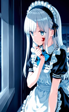 Artist:hiten_(hitenkei),(masterpiece),(best quality),illustration,ultra detailed,hdr,Depth of field,(colorful),loli,Amazing,highres,intricate detail,best illumination,best shadow,(late at night),night,(Dark blue theme),Depth of field,window,White curtains,1girl,solo,bangs,blood on face,dark persona,white hair,Blue bow tie,maid,Short sleeve,apron,maid headdress,long hair,hand on own chin,teary-eyed,blood on clothes,blood,maid apron,