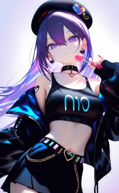 masterpiece,best quality,high quality,(colorful),1girl,solo,long hair,candy,hat,lollipop,purple eyes,jacket,food,holding,skirt,jewelry,earrings,looking at viewer,tattoo,purple hair,holding food,black headwear,holding candy,crop top,off shoulder,holding lollipop,black skirt,long sleeves,midriff,black jacket,choker,collarbone,heart,hair between eyes,belt,closed mouth,bare shoulders,nail polish,breasts,open jacket,sleeveless top,beret,cowboy shot,collar,sleeves past wrists,clothes writing,open clothes,black sleeveless top,