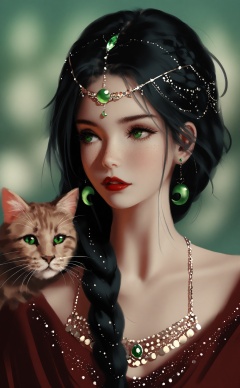 masterpiece,best quality,high quality,(colorful),artist wlop, 1girl, freckles, jewelry, green eyes, earrings, head chain, black hair, cat, red lips, braid, animal, long hair, parted lips, solo, green gemstone, portrait, gem, bare shoulders, circlet, lips, single braid, hair over shoulder, magatama earrings, blurry, looking to the side, eyelashes, crescent earrings, collarbone, diadem, blurry background