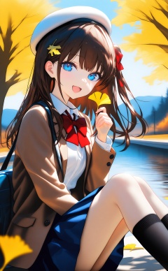 (masterpiece),(best quality),illustration,ultra detailed,hdr,Depth of field,(colorful),1girl,solo,skirt,outdoors,long hair,shirt,jacket,brown hair,looking at viewer,bag,sitting,socks,hat,pleated skirt,holding,bow,smile,tree,open mouth,white shirt,school uniform,blue skirt,school bag,black socks,bowtie,autumn,leaf,long sleeves,beret,hair ornament,holding leaf,red bow,collared shirt,kneehighs,open clothes,off shoulder,day,autumn leaves,white headwear,open jacket,blazer,:d,blue eyes,brown jacket,red bowtie,ginkgo leaf,knees up,one side up,water,from side,hand up,dress shirt,bag charm,charm (object),