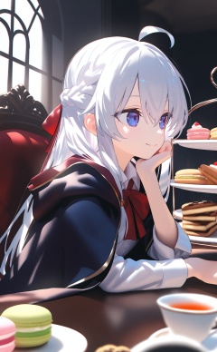masterpiece,best quality,high quality,(colorful),loli,1girl, elaina (majo no tabitabi), tiered tray, smile, food, solo, teacup, ahoge, teapot, window, cup, long hair, shirt, hair between eyes, head rest, bow, red bow, book, white shirt, white hair, blue eyes, long sleeves, collared shirt, braid, looking to the side, purple eyes, hand on own face, table, tea, closed mouth, robe, hand on own cheek, bowtie, red bowtie, saucer, macaron, indoors, cake, sitting, frills, upper body, cookie, cloak, sandwich, sunlight, open clothes, hood, hood down, coat, black coat, open robe, checkerboard cookie, black robe, elbow rest, ribbon, french braid