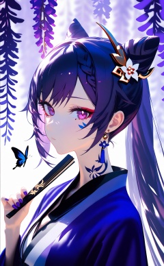 masterpiece,keqing \(genshin impact\),1girl,hair ornament,flower,jewelry,earrings,hand fan,purple hair,butterfly,cone hair bun,solo,hair bun,bug,folding fan,hair flower,holding fan,purple eyes,purple nails,looking at viewer,braid,long hair,holding,upper body,covering own mouth,nail polish,folded fan,alternate costume,butterfly tattoo,wisteria,chinese clothes,purple theme,sideways glance,facial mark,white flower,long sleeves,tattoo,blue butterfly,twintails,purple butterfly,double bun,sidelocks,diamond \(shape\),covered mouth,drop earrings,hanfu,tassel,hand up,diamond-shaped pupils,hairpin,facial tattoo,hair ears,ponytail,