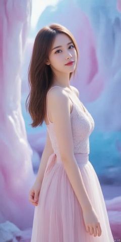 meinv,of a young Asian woman standing amidst a surreal, ethereal setting. The image is a hyperrealistic digital artwork, showcasing a young woman with fair skin and long, wavy brown hair cascading down her back. She stands with a slight turn to her right, gazing directly at the viewer with a serene expression. Her attire is a pastel-colored, sleeveless dress with a fitted bodice adorned with delicate lace and a flowing, voluminous skirt that transitions from pastel pink at the top to soft lavender at the bottom, creating a gradient effect. The dress adds a touch of elegance and whimsy to her appearance.