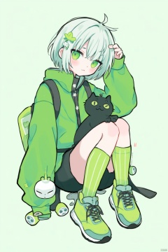 1girl, cat, green eyes, black cat, shoes, white hair, backpack, socks, looking at viewer, jacket, solo, sitting, sneakers, bag, bangs, green jacket, medium hair, animal, green theme, crossed legs, green socks, shirt