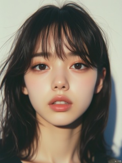 An eye-level shot of a woman's face, taken from a low-angle perspective. The woman's eyes are a piercing blue, and her eyebrows are a darker shade of brown. Her lips are a lighter shade of pink, and she has a slight smile on her lips. Her hair is a dark brown, with a few wispy bangs protruding from the top of her head. She has dark brown eyes, and dark brown eyebrows. The background is blurred, and the woman's shadow is visible on the right side of the frame. The photo is set against a white backdrop.