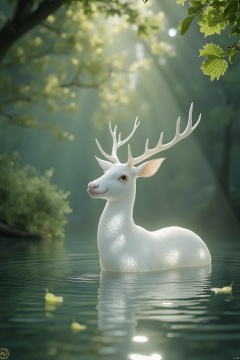An elegant white deer stands gracefully in water, depicted in a fine ancient Chinese brushwork style reminiscent of Chen Jialing, blending seamlessly with a dark fantasy theme. Sunbeams pierce through dense foliage, creating God rays that illuminate the scene. The deer appears transparent and ethereal, with visible contours and water ripples around its hooves. Bioluminescent organisms add an organic glow, enhancing the wide panoramic view and grand composition. High-definition texture details and vibrant colors showcase exquisite details, with high contrast lighting and a soft glow on the subject. The lush green forest environment exudes a tranquil atmosphere. The photo-realistic rendering, with depth of field control, focuses on the subject's details and the background environment, capturing the rich details and natural look in 32k UHD quality.