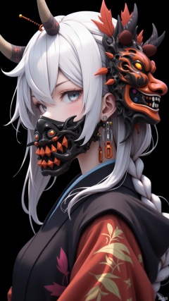Masterpiece, best quality, amazing details, CG,1girl,Solo, wearing a grimace mask on the back of the head, horns, hair accessories, braids, white hair, horns, bangs, black background, earrings, side, upper body, gray eyes, long hair, side, Japanese clothing, black and orange mechanical masks, simple background, kimono, hood, leaves, clip, shoulder hair