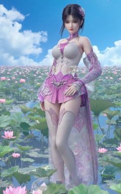 Masterpiece, the best quality, high quality,1girl,Lotus, blue sky, white clouds,(huge breasts:1.59),(A pond full of pink lotus flowers:1.39),Xhaiqinyan,Xlimuwan,Xqingege,Xxiaoyixian,Xyafei,XQhanfu