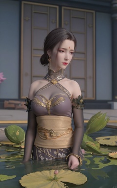 Masterpiece, the best quality, high quality,1girl,(huge breasts:1.59),(A pond full of pink lotus flowers:1.39),Xhaiqinyan,Xlimuwan,Xxiaoyixian,Xyafei,XMGqipao,Xxueshifu