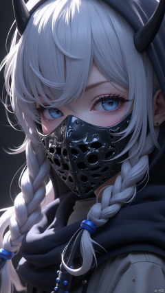 Masterpiece, best quality, amazing details,CG,1girl,solo, hood, black metal mask, sideways, close-up, looking at the audience, white hair, blue eyes, braids, hood up, eyelashes, long hair