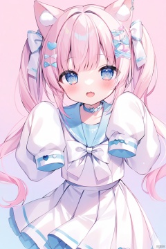 heart, 1girl, bow, white_bow, sleeves_past_fingers, sleeves_past_wrists, twintails, gradient, gradient_background, solo, virtual_youtuber, sailor_collar, long_hair, pink_background, hair_ornament, animal_ears, looking_at_viewer, skirt, open_mouth