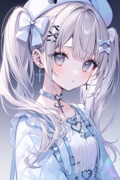 earrings, piercing, jewelry, ear_piercing, 1girl, bow, hat, gradient, white_bow, heart_earrings, cross_earrings, gradient_background, solo, twintails, hair_bow, long_hair, flower_earrings, grey_eyes
