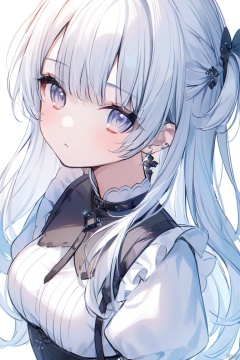 1girl, solo, earrings, long_hair, jewelry, bangs, puffy_sleeves, simple_background, closed_mouth, looking_at_viewer, white_background, medium_breasts, eyebrows_visible_through_hair, breasts, upper_body