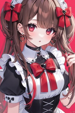 1girl, red_nails, nail_polish, solo, bow, red_bow, long_hair, brown_hair, earrings, hair_bow, short_sleeves, nail_art, multicolored_nails, jewelry, heart, puffy_short_sleeves, looking_at_viewer, holding_hair, red_eyes, upper_body, maid, maid_headdress