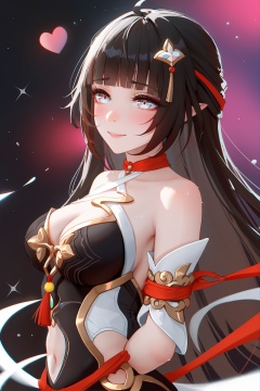 8k, best quality, masterpiece, (ultra-detailed), (high detailed skin), beautiful, intricate, amazing quality, very aesthetic, absurdres, masterpiece, (by nixeu, by wlop:0.7), [by raichiyo33], by anna dittmann, upper body, dynamic angle, chromatic aberration, sparkles, white eyes, slim body, cleavage, white skin, glossy skin, forehead, black and galaxy background, beautiful eyes, medium breasts, solo, happy, (black theme:0.81), 1girl, solo, bound, smile, bow, blush, arms behind back, heart, long hair, <lora:lingsha-atw2-Tanger:0.8>, lingsha, default clothes, red hands, red feet, black dress, 1girl, long hair, black hair, breasts, ahoge, high heels,