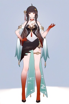 8k, best quality, masterpiece, (ultra-detailed), (high detailed skin), full body, full shot, standing, looking at viewer, (solo:1.2), simple background, white background, hand on own hip, <lora:lingsha-a3-Tanger-000014:0.8>, lingsha, default clothes, red hands, red feet, black dress, 1girl, long hair, black hair, breasts, ahoge, A full-body portrait of a young girl, standing gracefully, pastel art style, high-key lighting, shoujo manga influence, hd quality, delicate details,