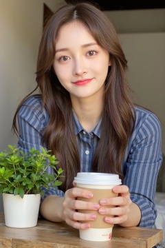 A young woman with long, rich brown hair sits comfortably indoors, her bright brown eyes locked onto the viewer's gaze as she flashes a warm smile. Her arms cradle a disposable cup on a worn wooden table beside a small potted plant. A blue and grey striped shirt complements her natural beauty, while her lips curve upward in a gentle grin, inviting the viewer into her intimate moment.