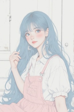 1girl, solo, long hair, looking at viewer, blush, smile, blue eyes, shirt, white background, dress, jewelry, very long hair, closed mouth, blue hair, white shirt, short sleeves, earrings, puffy sleeves, puffy short sleeves, parted bangs, pink dress, stairs