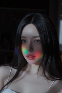 dark,caustics,colorful,gorgeous light and shadow,fullbody,The girl's pale skin,her lips are slightly open to reveal her teeth,and her blue eyes are blurry and dreamy.mott led light and shadow,portrait,black_hair,
