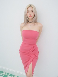 a woman in a pink strapless dress stands in front of a white wall. The woman's dress is adorned with a black chain around her neck, The backdrop is a stark white, with a green checkerboard pattern on the floor, creating a stark contrast to the woman's outfit.