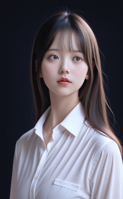 masterpiece,best quality,high quality,1girl,solo,shirt,long hair,black hair,realistic,white shirt,brown eyes,parted lips,collared shirt,upper body,photorealistic,asian,lips,blurry,blurry background,nose,looking afar,long sleeves,black eyes,wing collar,dress shirt,signature,brown hair,looking ahead,night,k-pop,artist name,red lips,dated,partially unbuttoned,light,depth of field,unbuttoned,dark background,expressionless,buttons,