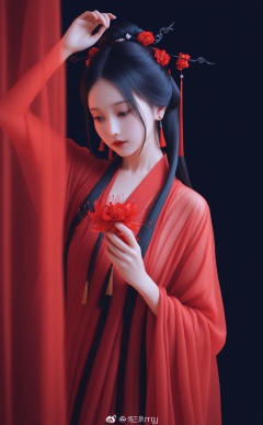 masterpiece,best quality,high quality,1girl,flower,tassel,spider lily,holding flower,curtains,solo,looking down,tassel earrings,hair ornament,upper body,jewelry,earrings,holding,chinese clothes,red flower,black hair,weibo logo,weibo username,light,hanfu,red curtains,long hair,dress,red lips,expressionless,hand up,red theme,realistic,hair bun,blurry,tassel hair ornament,looking at object,arm up,hair stick,dark,ribbon,dark background,