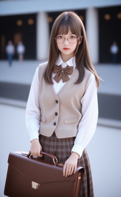 masterpiece,best quality,high quality,1girl,solo,brown hair,shirt,glasses,holding,long sleeves,long hair,red lips,holding bag,blurry,bowtie,skirt,briefcase,bow,white shirt,bag,blurry background,collared shirt,photorealistic,brown bag,vest,brown bow,looking at viewer,dated,suitcase,holding briefcase,realistic,closed mouth,photo background,brown bowtie,lipstick,