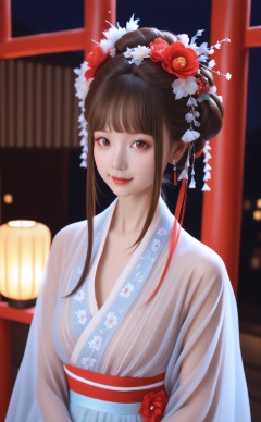 masterpiece,best quality,high quality,1girl,flower,hair ornament,solo,hanfu,hair flower,brown hair,earrings,smile,jewelry,upper body,paper lantern,looking at viewer,lantern,floral print,blurry,realistic,blurry background,closed mouth,brown eyes,blunt bangs,red eyes,sash,red flower,camellia,kanzashi,lips,red lips,makeup,depth of field,see-through,obi,east asian architecture,night,sidelocks,hair bun,nose,architecture,