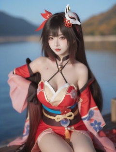<lora:花火-000008:0.7>,huohua in a red kimono holds a white and red mask.,red dress of flower fire,breasts,looking at viewer,cleavage,bare shoulders,detached sleeves,choker,mole,sash,mole under eye,obi,mask on head,fox mask,Ultra-realistic 8k CG,masterpiece,best quality,(photorealistic:1.4),HDR,absurdres,Professional,RAW photo,lens flare,(film grain:1.1),Bokeh,((Depth of field)),studio light, a woman is kneeling down and ,1girl, black_hair, day, from_side, horizon, lake, lips, long_hair, long_sleeves, mountain, nose, ocean, outdoors, river, scenery, shore, sky, snow, solo, sunrise, upper_body, water, waves, Highly detailed,Professional,extreme detail description;,