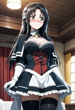 score_9,score_8_up,score_7_up,source_anime,Marguerite Farom,1girl,solo,breasts,blush,large breasts,skirt,hair ornament,gloves,dress,thighhighs,cleavage,medium breasts,standing,indoors,black thighhighs,elbow gloves,white gloves,looking to the side,zettai ryouiki,embarrassed,