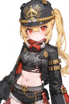 best_quality,(masterpiece),artist_ningen_mame,artist_ciloranko,artist_rhasta,8k,ultra-detailed,2d,anime,line_style,1girl,solo,long hair,breasts,looking at viewer,blonde hair,simple background,shirt,red eyes,long sleeves,hat,white background,navel,hair between eyes,closed mouth,jacket,upper body,open clothes,shorts,midriff,belt,stomach,side ponytail,open jacket,black jacket,crop top,torn clothes,black shirt,black headwear,arms at sides,mask,helmet,pouch,belt pouch,ammunition belt,<lora:AS-线稿大师加强版_v1.0:0.3>,<lora:fangdongye XL 1.3-000051:0.3>,<lora:lora.by_tusi:0.7>,