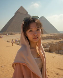 (RAW photo, 4k, realistic, exquisitely detailed skin),masterpiece,best quality,unity 8k wallpaper,ultra detailed,cinematic look,natural skin texture,extremely realistic skin texture,finely detailed face,(film grain:1.2),cinematic angle,Fujifilm XT3,,(highlydetailed),(bright scene),(In the windy Sahara Desert, with the Sphinx Pyramid in the back, a Chinese beauty, wearing a strapless low-cut robe and sunglasses on her head, looked at everyone with a smile,full body)