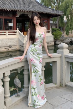 Masterpiece, best quality, stunning details, realistic photos, 1girl, long flowing hair, high quality fair skin, big breasts, (high-cut cheongsam), (shiny pantyhose), long legs, high heels, fashion pose, full body, (West Lake), long stone bridge, Chinese style pavilion,
