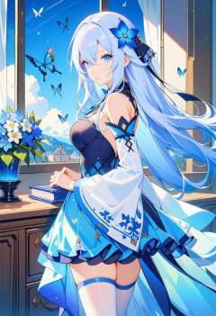 masterpiece,best quality,1girl,solo,long hair,breasts,looking at viewer,bangs,blue eyes,hair ornament,thighhighs,long sleeves,dress,bow,hair between eyes,bare shoulders,medium breasts,blue hair,standing,flower,white hair,detached sleeves,sky,cloud,indoors,hair flower,wide sleeves,from side,white thighhighs,blue sky,book,window,floating hair,blue dress,bug,white flower,butterfly,blue flower,blue theme,drawer,