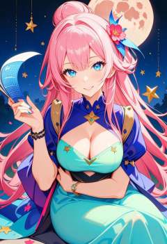 masterpiece,best quality,1girl,solo,long hair,breasts,smile,bangs,blue eyes,large breasts,hair ornament,dress,holding,cleavage,jewelry,sitting,very long hair,pink hair,flower,short sleeves,puffy sleeves,hair bun,star \(symbol\),nail polish,bracelet,puffy short sleeves,book,clothing cutout,blue dress,moon,cleavage cutout,single hair bun,instrument,pink flower,holding book,green dress,shawl,long dress,aqua dress,