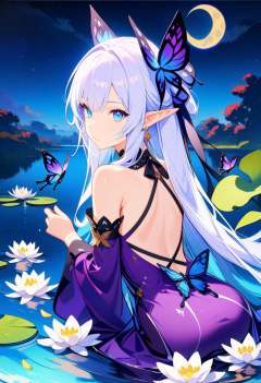 masterpiece,best quality,1girl,solo,long hair,looking at viewer,bangs,blue eyes,hair ornament,dress,bow,bare shoulders,jewelry,sitting,very long hair,closed mouth,flower,white hair,earrings,detached sleeves,sky,pointy ears,looking back,hair flower,water,petals,night,animal,moon,bug,elf,butterfly,night sky,purple dress,full moon,backless outfit,purple flower,crescent moon,blue butterfly,lily pad,