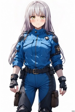 1girl, solo, long hair, looking at viewer, blush, bangs, simple background, gloves, white background, holding, closed mouth, jacket, yellow eyes, white hair, belt, pants, fingerless gloves, uniform, hand on hip, police, police uniform, policewoman,minato yukina,purple hair,Yukina,grey hair