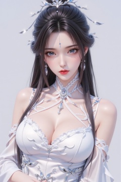 1girl,breasts,hair ornament,long hair,blue eyes,solo,dress,jewelry,earrings,white dress,clothing cutout,upper body,forehead mark,hair bun,large breasts,cleavage,looking at viewer,facial mark,cleavage cutout,black hair,single hair bun,parted lips,brown hair,