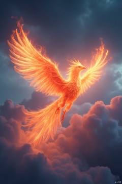 A majestic, transparent fire phoenix soaring through a celestial sky, its body composed of intricate, glowing flames. The phoenix is framed mid-flight, with its wings outstretched, creating a dynamic composition. The transparent flames emit a soft, radiant light, casting ethereal shadows on the surrounding clouds. The background features a gradient of deep blues and purples, emphasizing the otherworldly atmosphere. The scene is illuminated by a gentle, ambient glow, highlighting the delicate, fiery details of the phoenix.