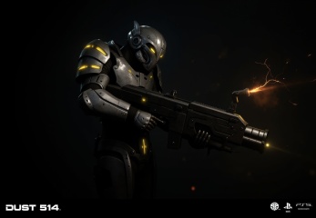 FuturisticWarrior style,,This image portrays amarr haevy, heavily armored in a high-tech, metallic exosuit. The armor is more bulky and robust, with intricate layers of plating in a silver and gray color scheme, accented by glowing yellow lines that give the suit a powerful, advanced look. The soldier's helmet is large and features a visor, adding to their intimidating presence. They are wielding an oversized, forge gun, with visible energy crackling near its muzzle, indicating it may be some kind of advanced energy. The overall scene is dark and gritty, with the background mostly obscured, adding a mysterious atmosphere. The amarr haevy's stance is firm, with both hands gripping the weapon as if preparing for combat. The "DUST 514" and PlayStation 3 logos at the bottom suggest this is part of a promotional image for the game.