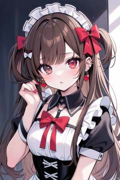 1girl, red_nails, nail_polish, solo, bow, red_bow, long_hair, brown_hair, earrings, hair_bow, short_sleeves, nail_art, multicolored_nails, jewelry, heart, puffy_short_sleeves, looking_at_viewer, holding_hair, red_eyes, upper_body, maid, maid_headdress
