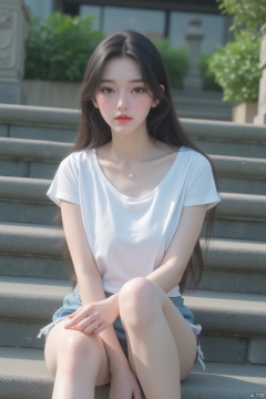 A serene 8K photo, eye shadow, red lips, Added a whimsical atmosphere. delicate face, A young woman with long black hair, wearing a white t-shirt and denim shorts, sat on a set of gray stone steps. The lady crossed the steps with her left leg and placed her right leg on the steps. She was wearing a pair of casual shoes with her right hand on her lap. The image background is clear, with green plants and stone carvings in the upper right corner.