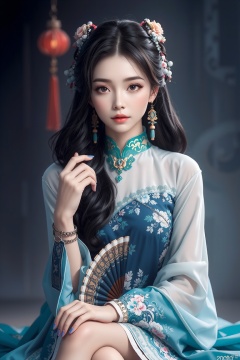 Masterpiece, best quality, amazing details,1girl,Chinese Yi ethnic clothing, black hair, bracelet, brown eyes, chinese clothes, dress, earrings, hair ornament, hand fan, jewelry, lips, looking at viewer, parted lips, sitting, solo, watch, wristband