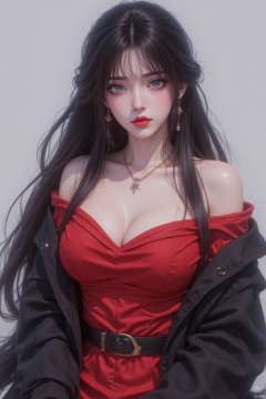 1girl, solo, long hair, breasts, looking at viewer, bangs, black hair, dress, jewelry, very long hair, jacket, earrings, belt, necklace, off shoulder, black jacket, grey eyes, makeup, wavy hair, red dress, lipstick, black belt, red lips